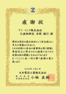 この度、日本電設工業株式会社 北海道支店様より、当社が「施工業務を行うにあたり、安全の確保や事故防止に尽力している」として感謝状を頂きました。